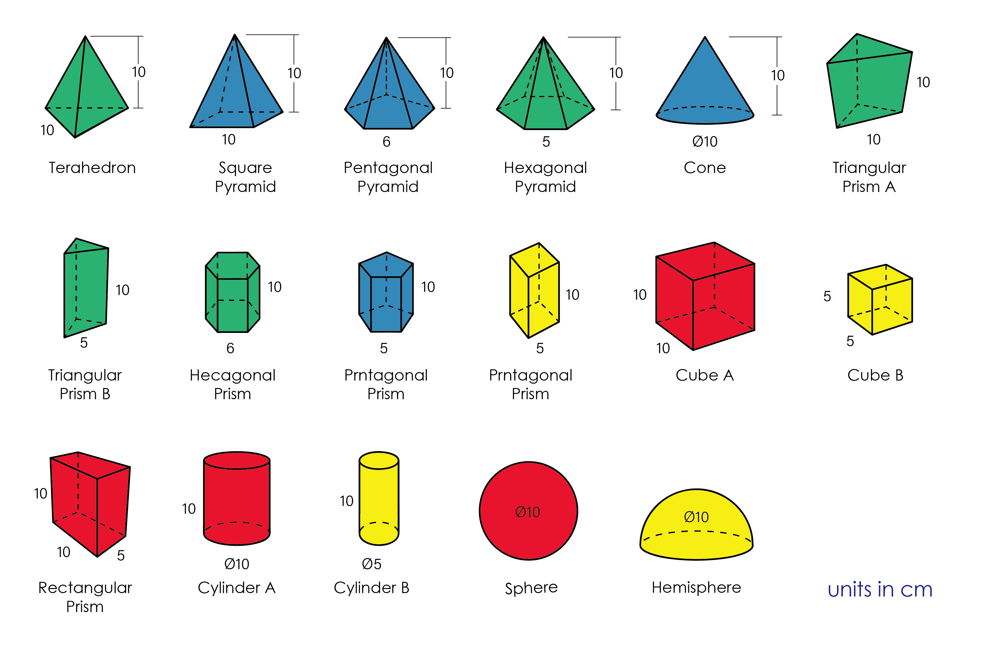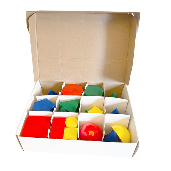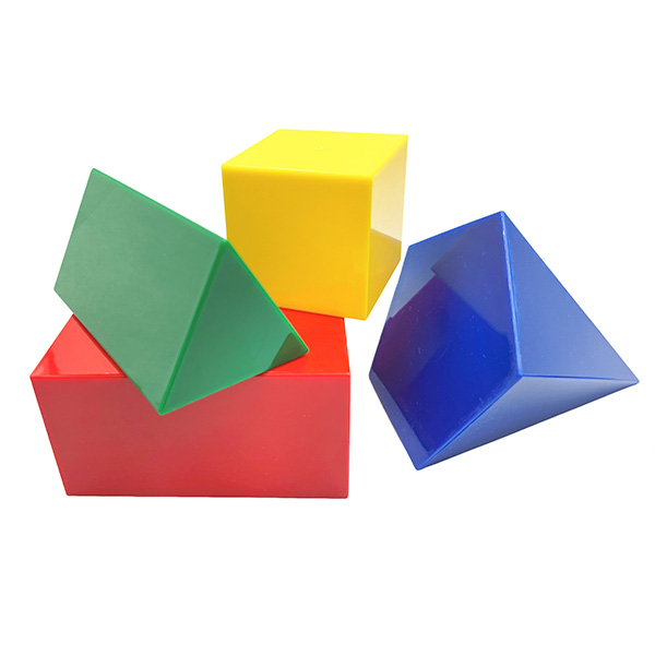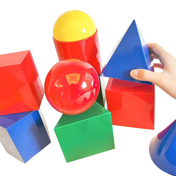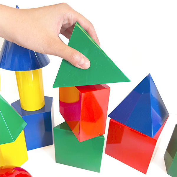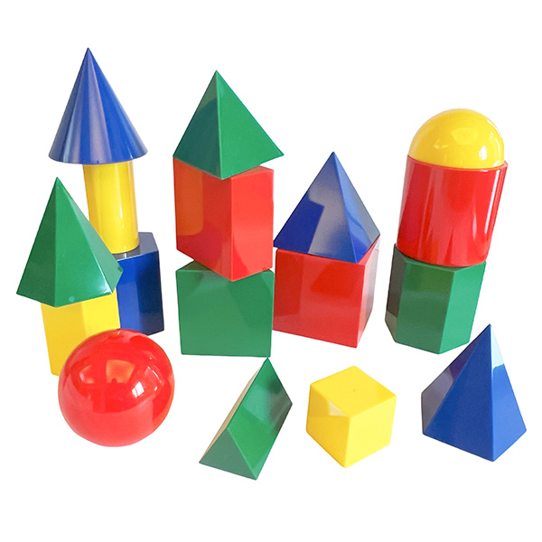 Comes in 4 colors and 17 different 3D shapes, including the cube, rectangular, cylinder, sphere, and triangular prism...and more. Easy for little hands to grab. Ideal for kids to learn the relationships between area, colors, shapes, form, and more.