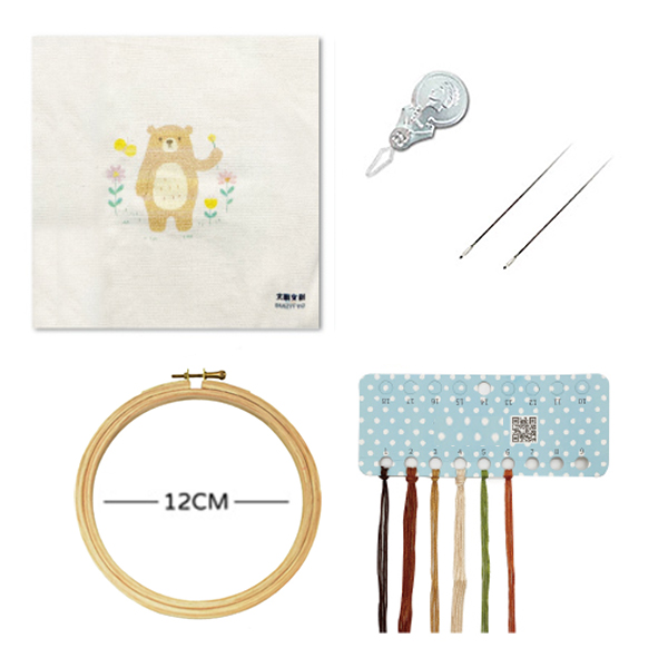 Content: 1 Bamboo Embroidery Hoop, Color Threads, 1 Stamped Embroidery Fabric, 2 Needles, 1 Threaders, and Color Instruction.