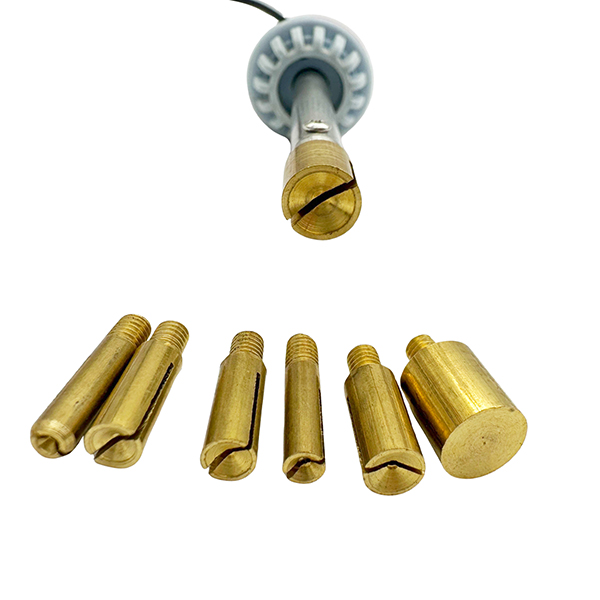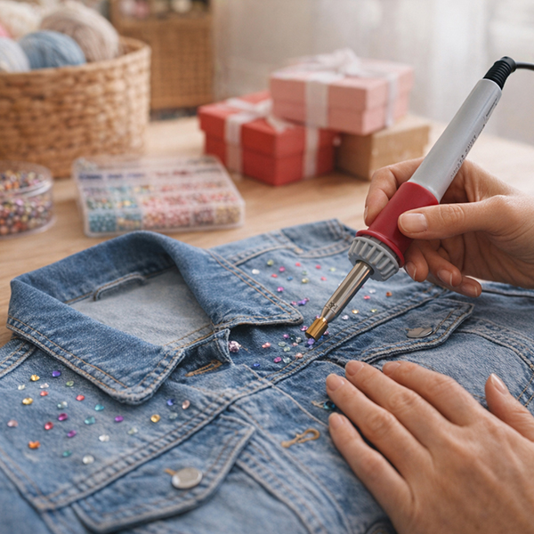 bridal ateliers, footwear manufacturers, and DIY craft businesses. Featuring 7 interchangeable lead-free brass tips, this compact yet powerful device enables fast, clean, and consistent application of hot-fix rhinestones onto fabrics, leather, and synthetic materials—without glue, sewing, or mess.