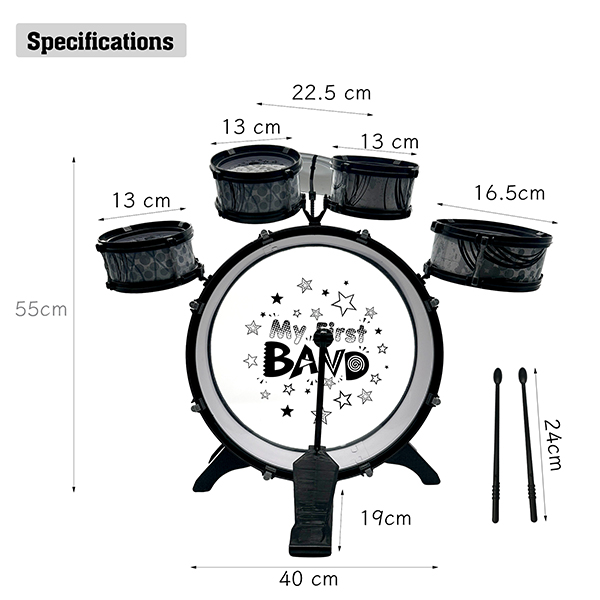 The drum set delivers bright, crisp, and resonant sounds that inspire creativity while helping kids develop hand-eye-foot coordination, auditory perception, and self-expression. Its tool-free assembly system allows quick setup and easy storage—ideal for homes, classrooms, parties, or outdoor performances. Packaged in a vibrant full-color retail box, it’s ready for shelf display and makes a perfect gift for birthdays, holidays, or educational rewards.