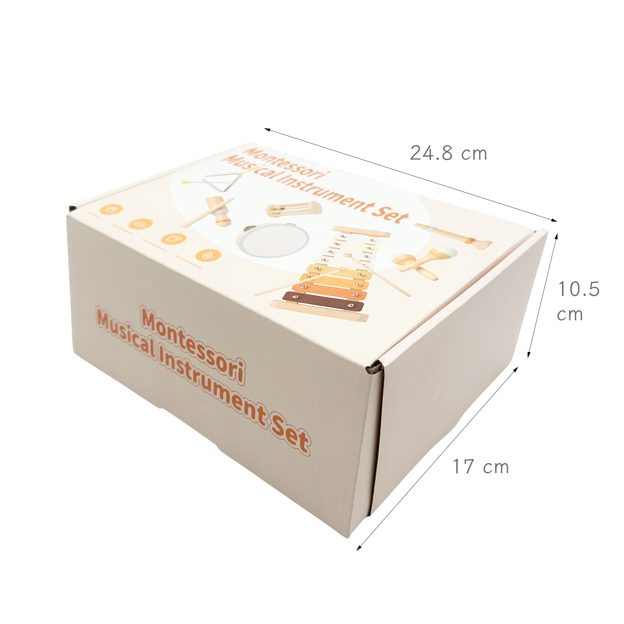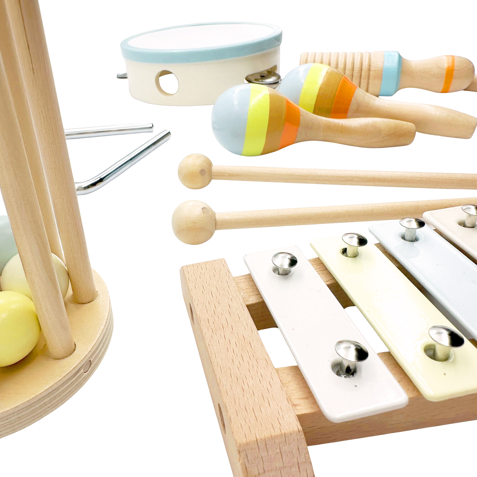 Set Includes: Wooden Xylophone with Mallets, Tambourine, Triangle Bell with Striker, Maracas, Hand Shaker, Jingle Bells (7 Pieces Total).
